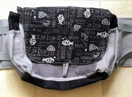 Hybridní zavazadlo, takový "ledvinkoonbag" - taška kolem pasu vhodná při nošení dětí v šátku či nosítku. Má 12 cm široký látkový popruh, který pěkně přilne k tělu a nikde netlačí. Zapíná se na dvě plastové spony, které se dají dotahovat.