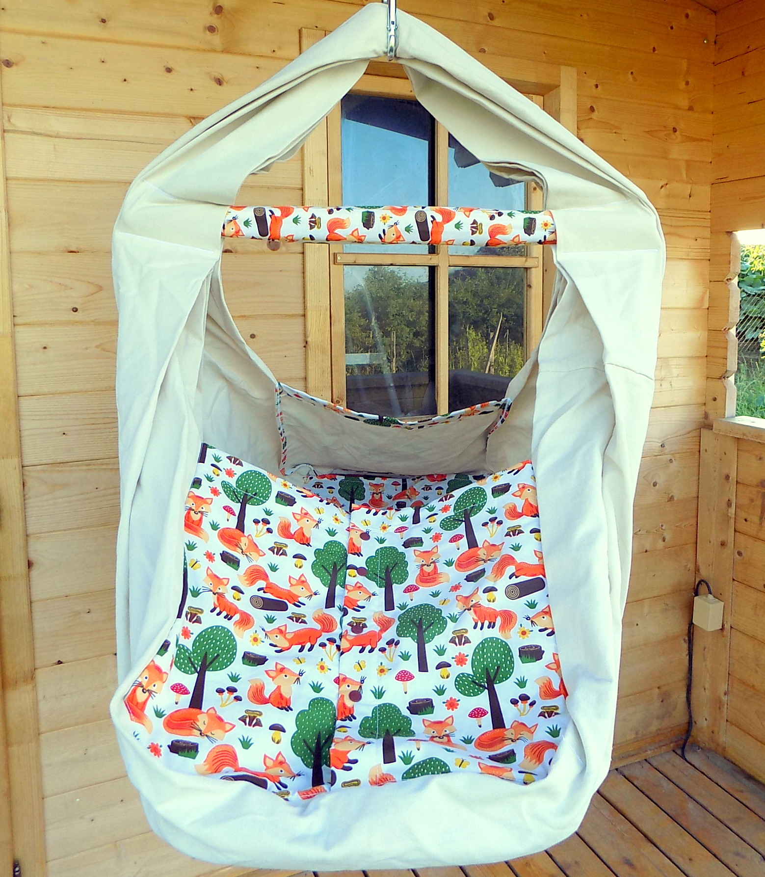 Látková kolébka má dvojité dno (resp. tunel na dně), kam se dává složená deka nebo speciální matračka z kokosových vláken, příp. z ovčí vlny nebo pohankových slupek (matrace není součástí základní dodávky). Houpačku lze uzavřít dvěma chlopněmi, které se zapínají na patentky (druky), za příplatek lze na chlopně našít ještě jisticí tkanice.