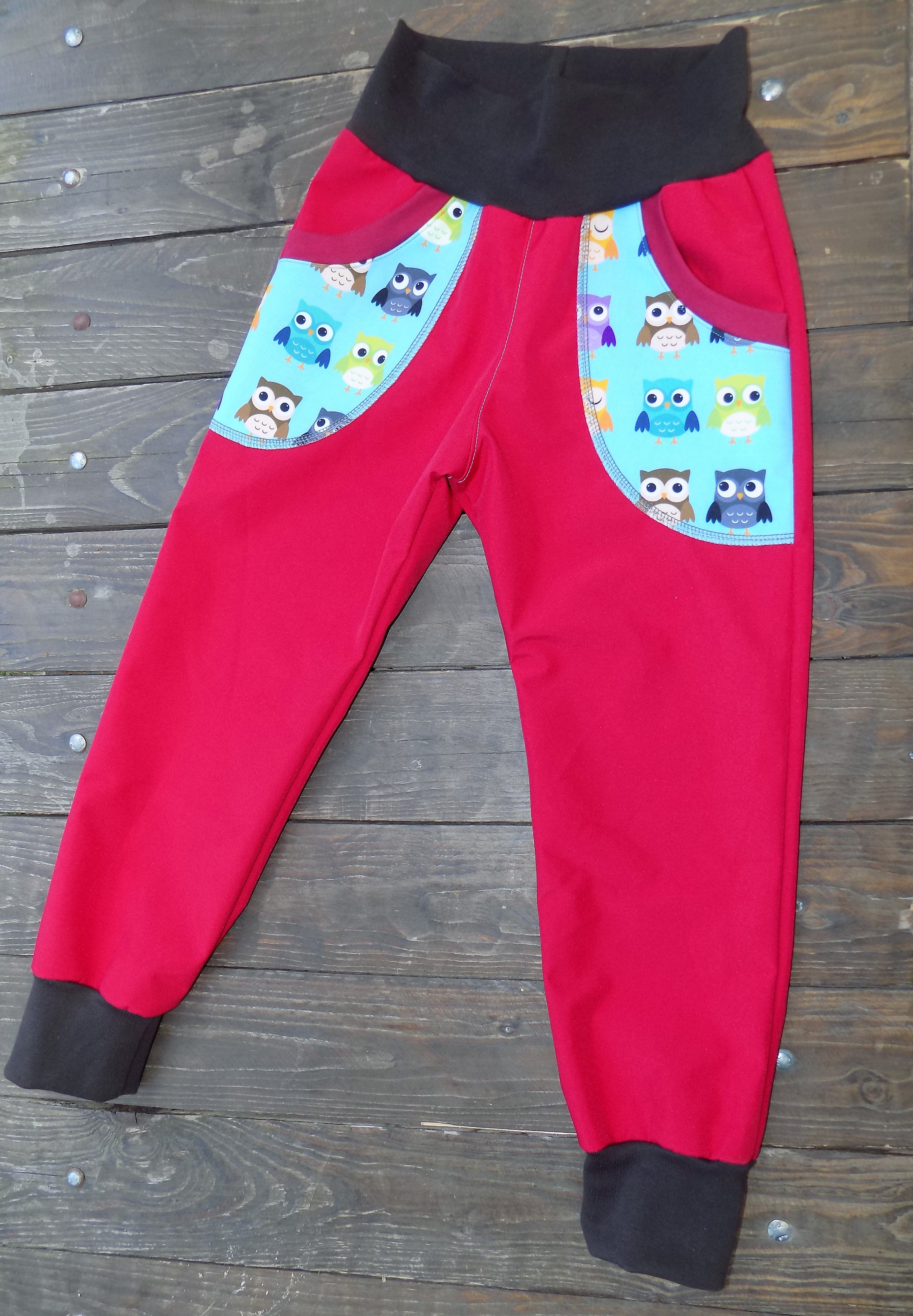 Kalhoty mají dvě postranní kapsy, v pase široký pružný úplet s dírou na protaženní gumy, díky němuž dobře padnou na různé typy postav a dítěti nelezou záda. Přední i zadní sed je prošitý z důvodu vyšší odolosti. Do poznamky uveďte ideálně obvod pasu dítěte.