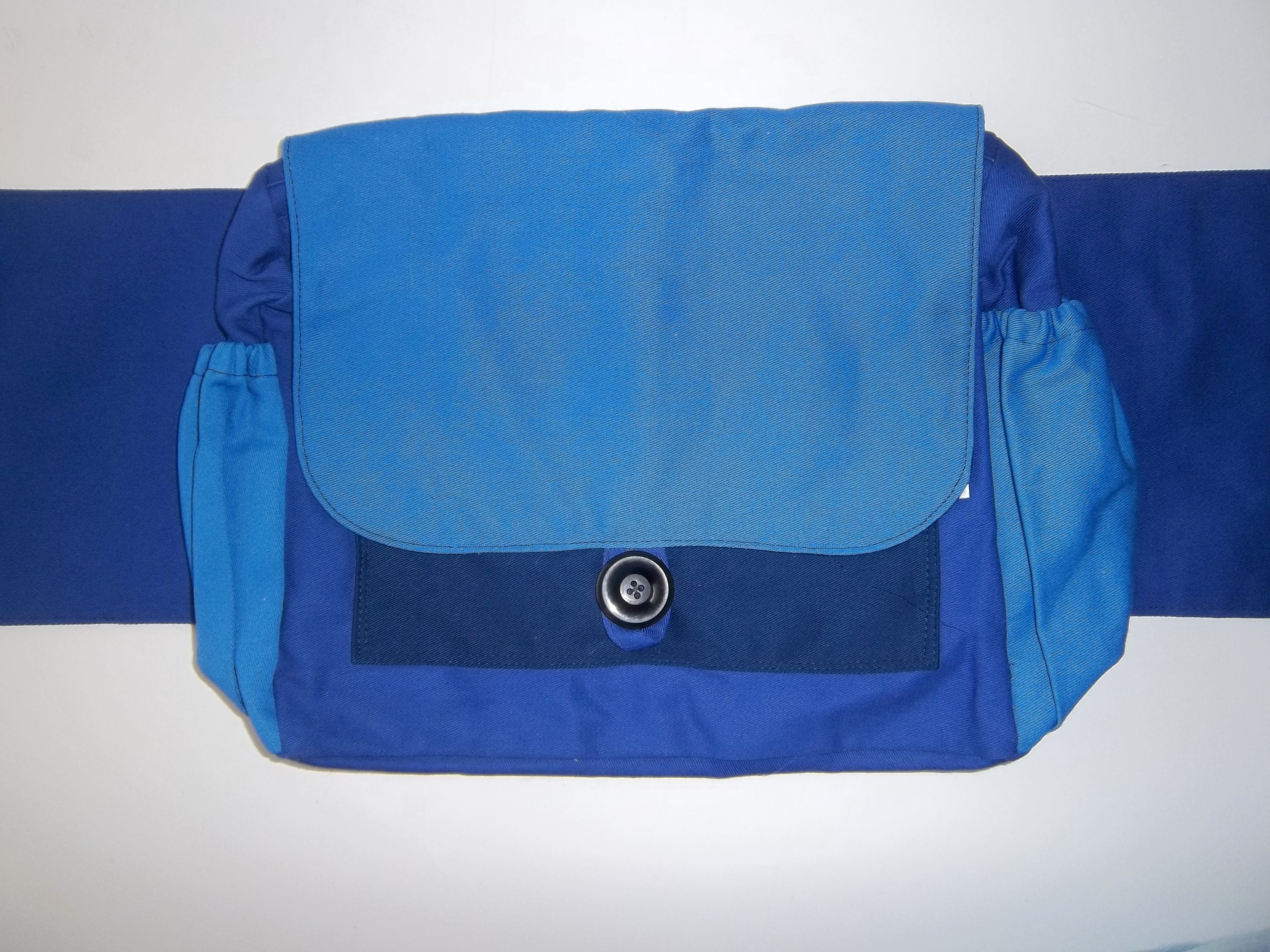 Hybridní zavazadlo, takový "ledvinkoonbag" - taška kolem pasu vhodná při nošení dětí v šátku či nosítku. Má 12 cm široký látkový popruh, který pěkně přilne k tělu a nikde netlačí. Zapíná se na dvě plastové spony, které se dají dotahovat.